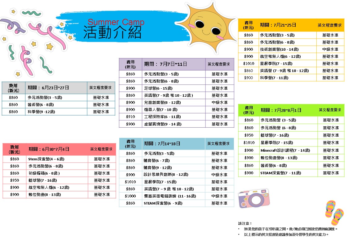 - 營地活動費包含午餐及材料費。(第二夏令營享有10% 折扣)
